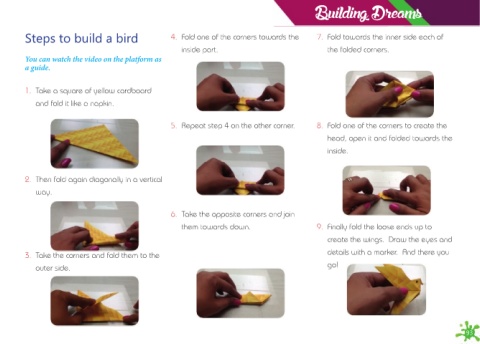 Steps to build a bird 4. Fold one of the corners towards the 7. Fold towards the inner side each of